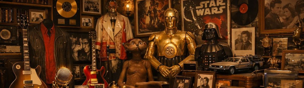 Costumes de tournage, accessoires de plateau, décors, concept arts et travaux préparatoires, éléments de production, scénarios originaux, scripts annotés, celluloïds d’animation, affiches de cinéma, photos de plateau et archives de films et de séries cultes.